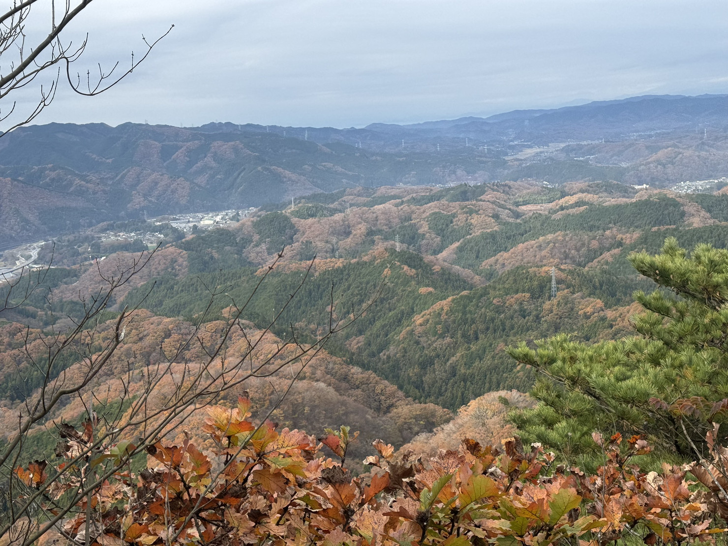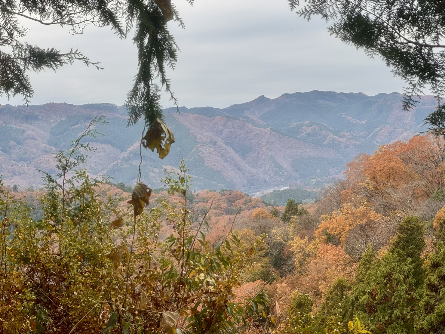 さらに登り続けると木立の隙間からのぞく遠景が錦秋のパッチワークばかり。