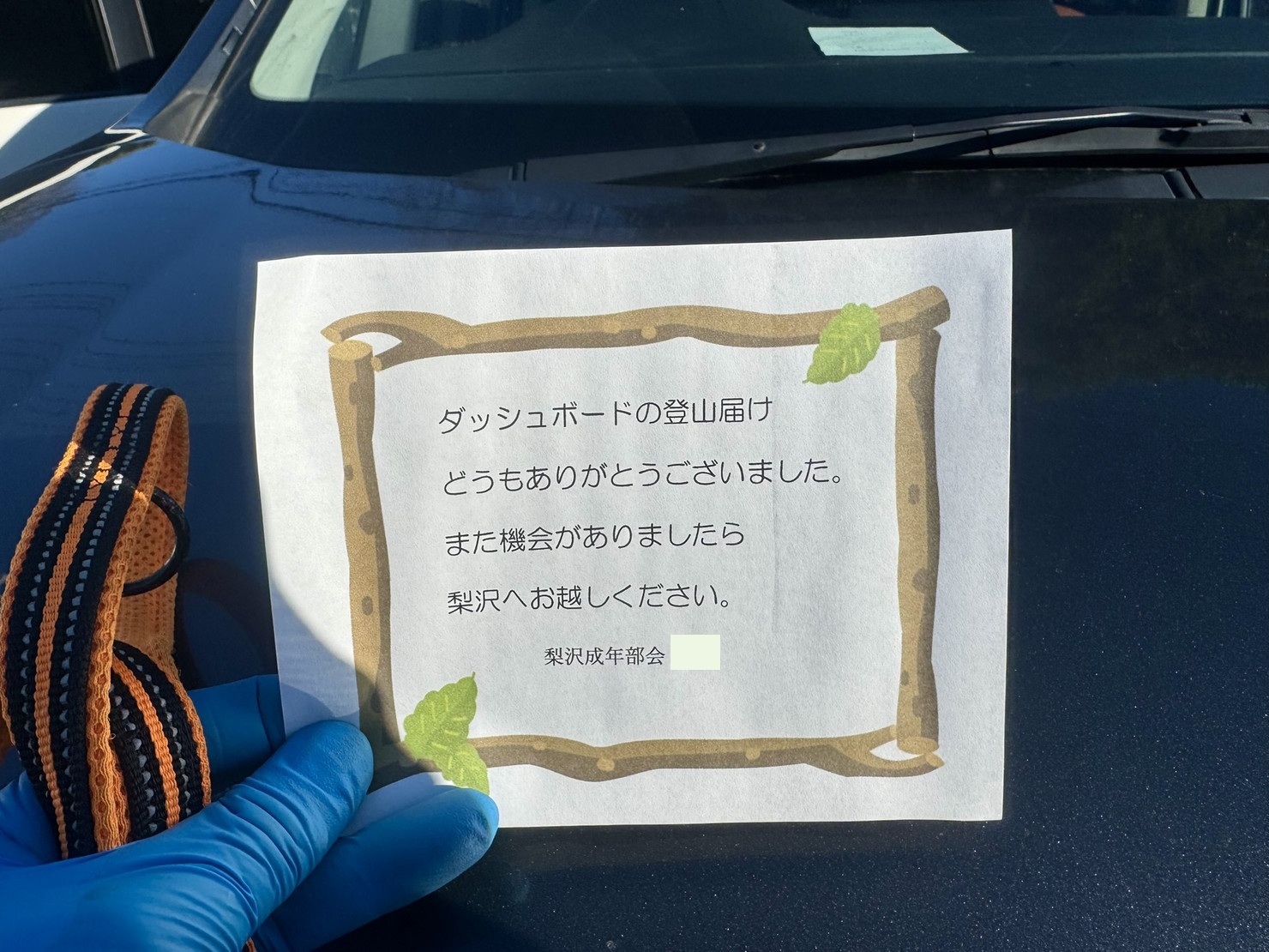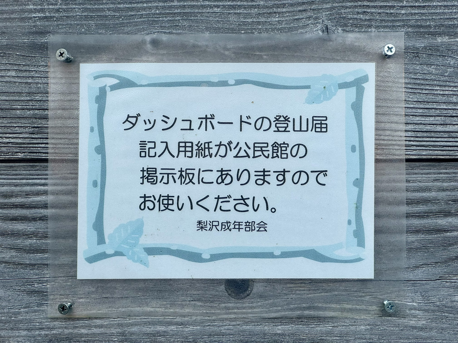 掲示板に登山届の用紙があるので、記入してダッシュボードに置いておく。