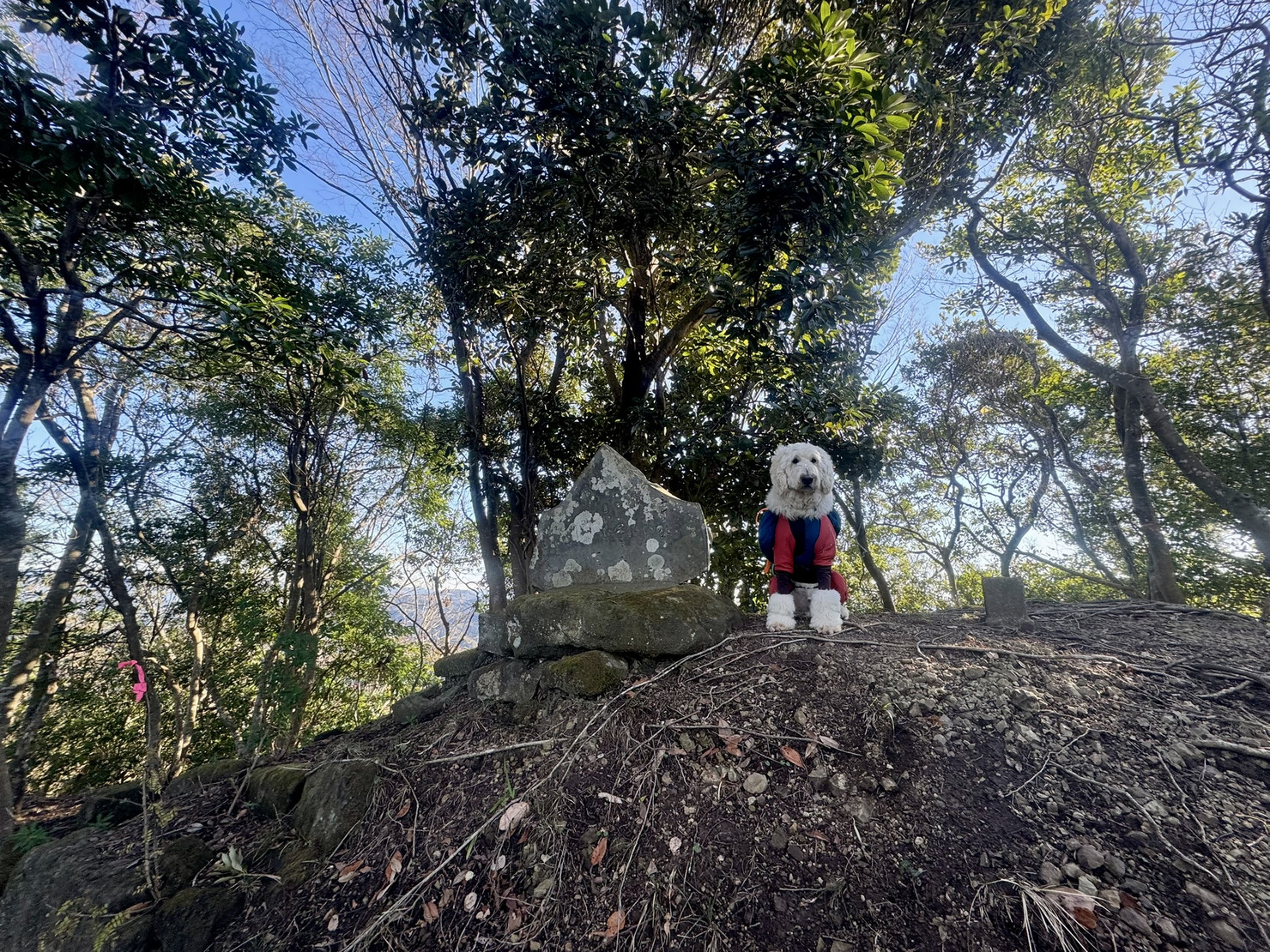 「なんだぁ~」と山頂に設置されていた石碑を眺めて何気なく振り向いた瞬間、木立の間に何かを見つけて目を見開く。