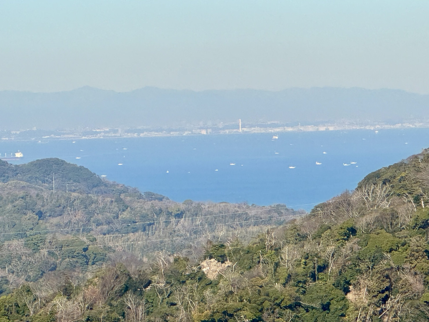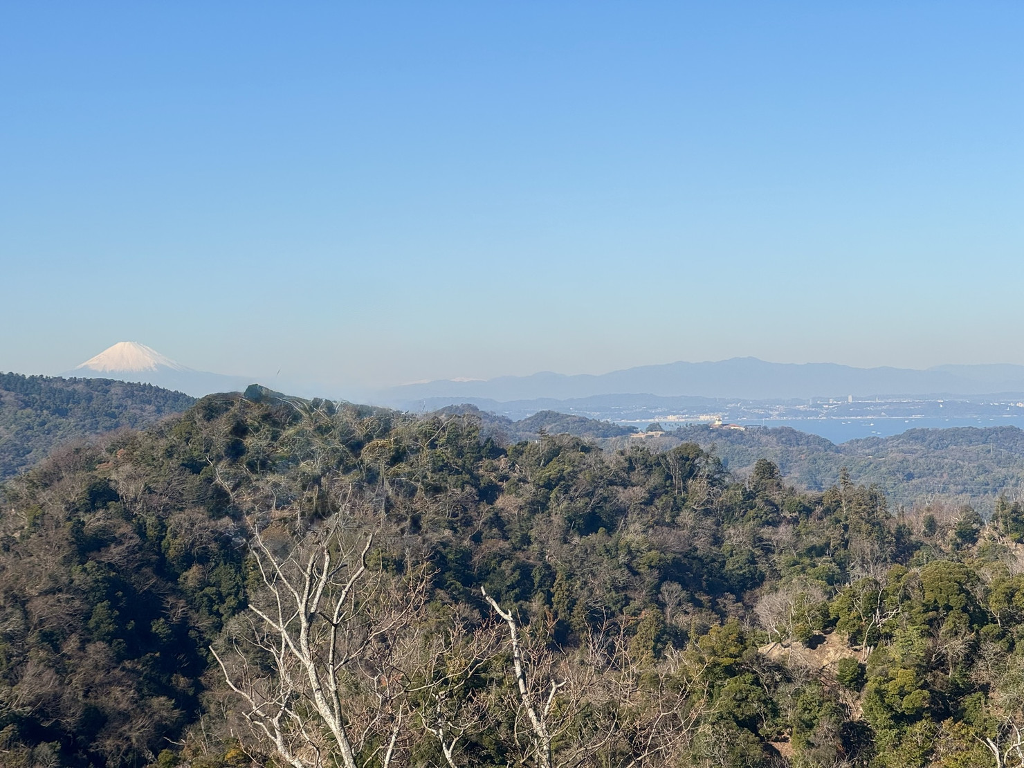 雲一つない紺碧の空の下、地平線の先まで南房総の山々が広がっている。