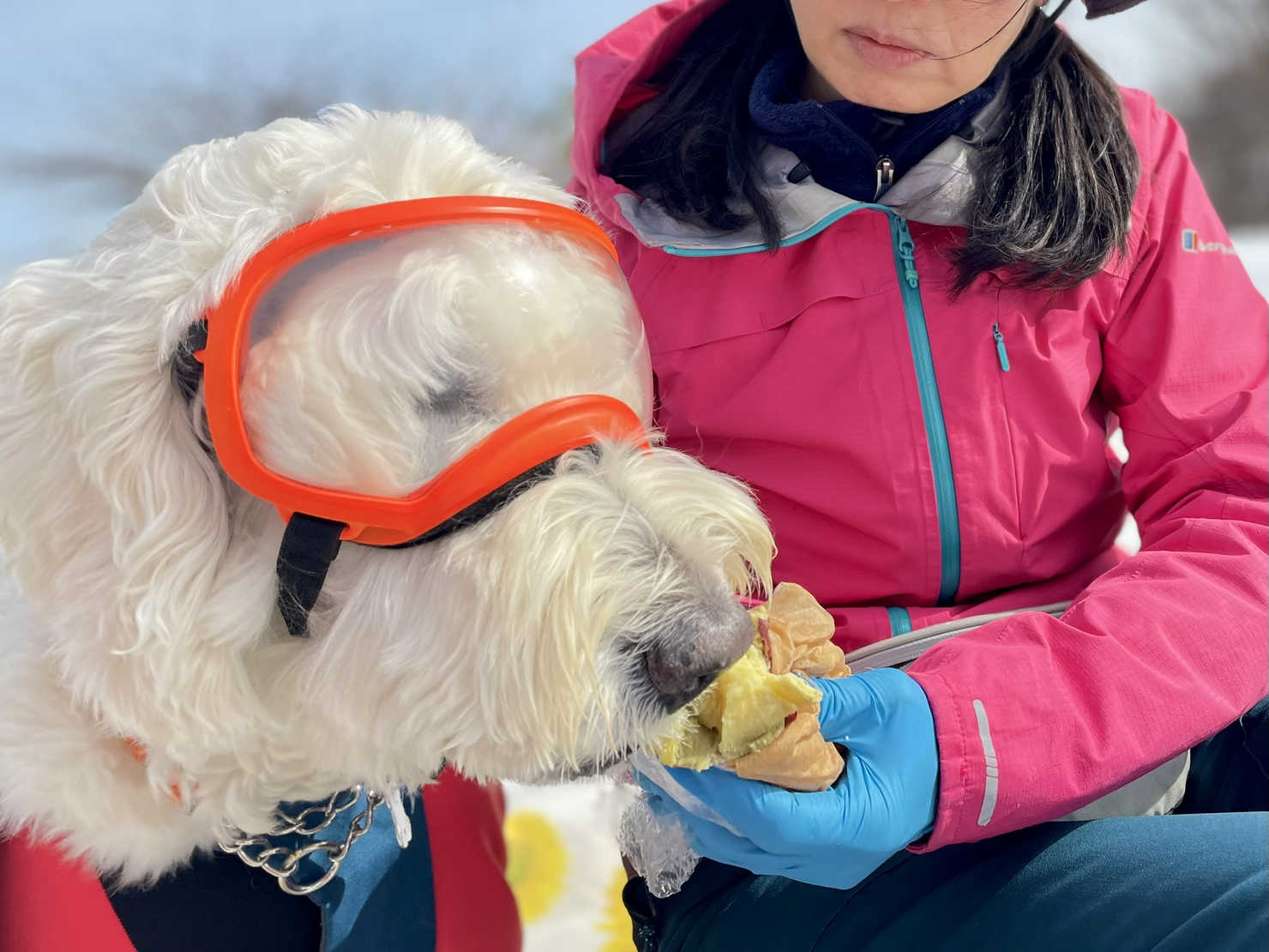 彼が大好物の木の棒を拾ってあげたいが、雪に埋もれて見つからない。