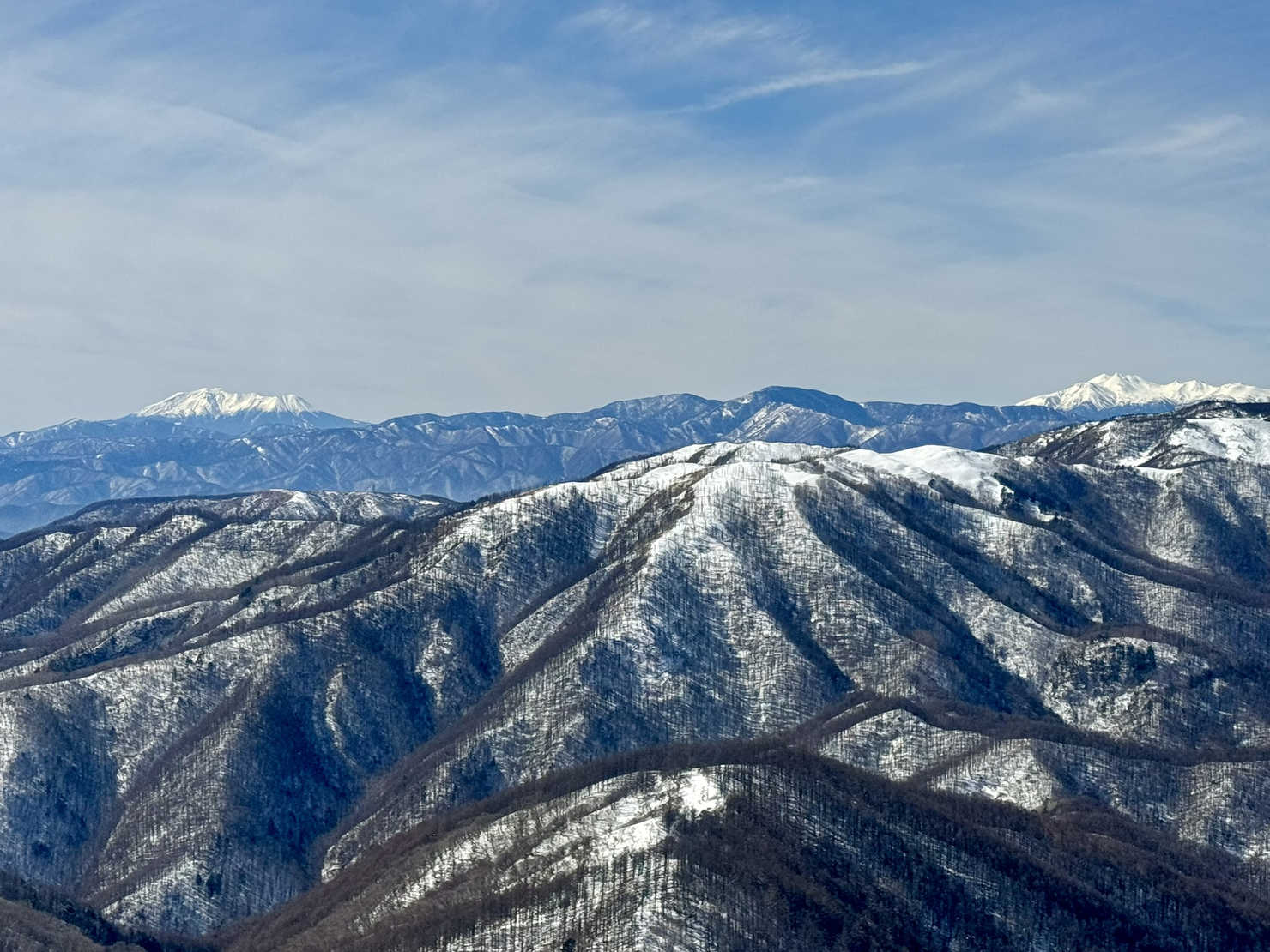 特に山頂から下の積雪の幅が、横の南・中央アルプスと段違い。
